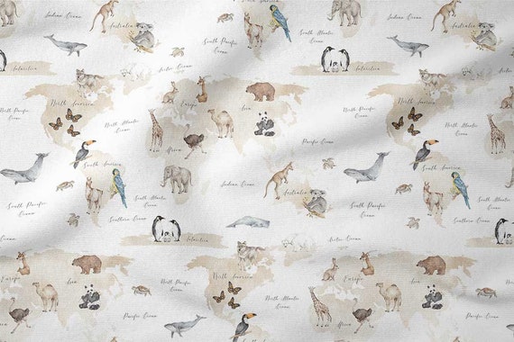 Travel Fabric, World Map With Animals Premium Cotton Fabric, Baby